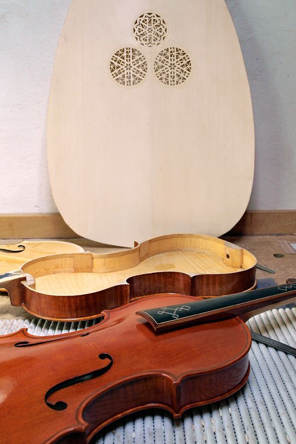 À l'image des ateliers d'autrefois (Stradivari fabriquait aussi des guitares, des harpes ou des mandolines), je travaille sur les instruments à cordes frottées en montage moderne et baroque, ainsi que sur les instruments à cordes pincées comme les luths et les guitares baroques.